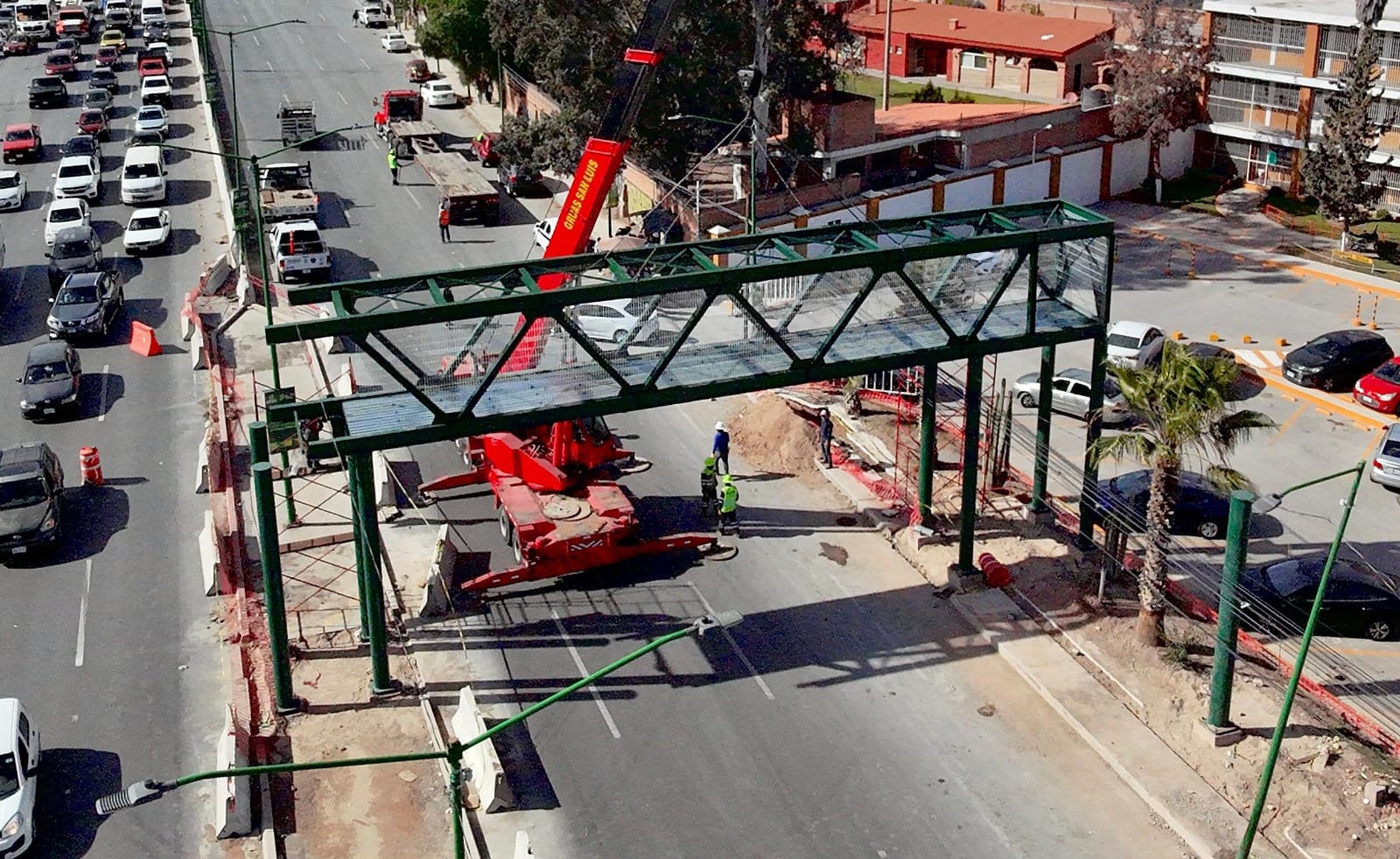 Se lleva a cabo el cierre total de carriles sobre Bulevar Valle de Los Fantasmas – Carretera Rioverde, específicamente a la altura del Colegio Valladolid con dirección al Distribuidor Juárez, esto debido a la instalación de la estructura que integrará el puente peatonal.