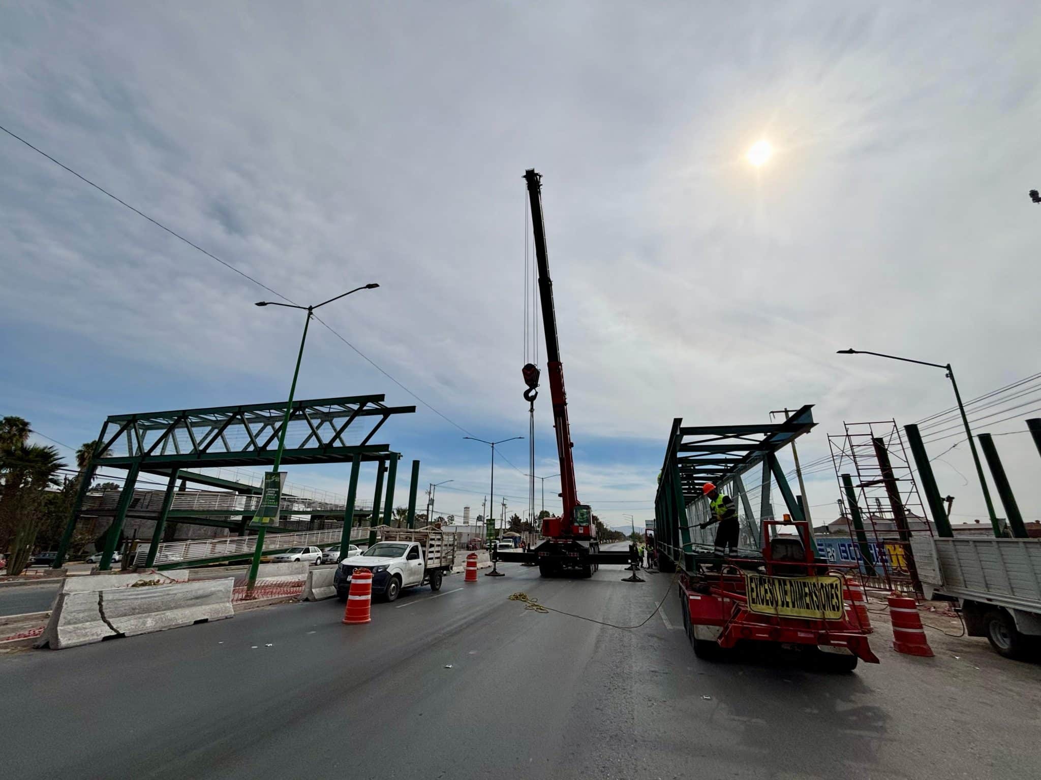 Se lleva a cabo el cierre de circulación en Bulevar Valle de Los Fantasmas – Carretera Rioverde con dirección a Ríoverde, a la altura del colegio Valladolid debido a la instalación de la la colocación de infraestructura del puente peatonal, por lo que oficiales de la corporación vial abanderan la zona para resguardar el área, agilizar el tráfico e indicar rutas alternas.