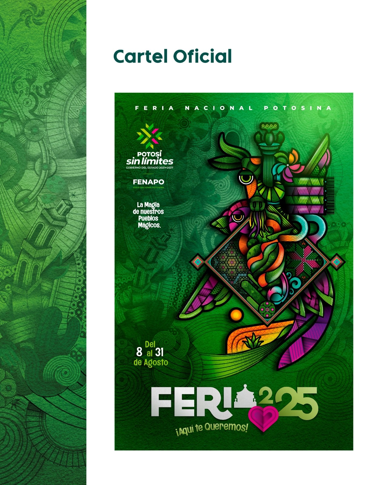 El cartel simboliza el patrimonio compartido y el compromiso por preservarlo, combinando máscaras tének y pame, rebozos, cultura huichol, arquitectura colonial, cerros, bordados, semillas y minerales en un diseño moderno que refleja la vitalidad y orgullo de los pueblos potosinos.