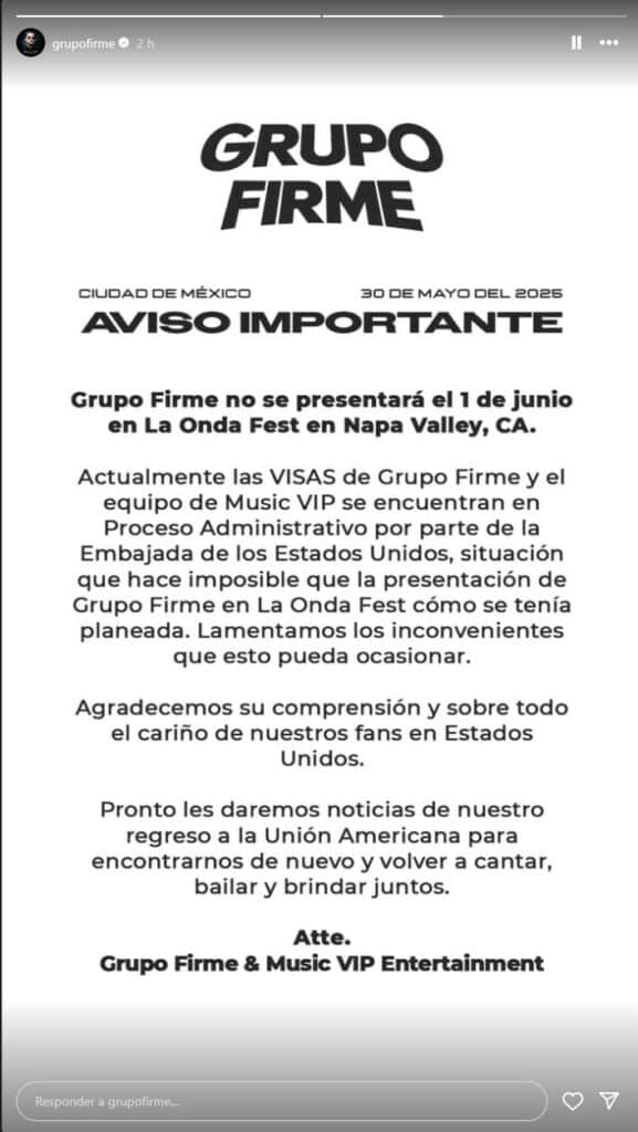 Actualmente, las visas de Grupo Firme y del equipo de Music VIP están en proceso administrativo por parte de la Embajada de Estados Unidos, situación que imposibilita la presentación de Grupo Firme en La Onda Fest, como se tenía planeado”, informó la agrupación musical en un comunicado.