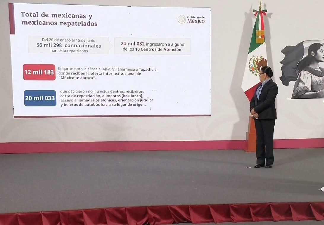 Durante la conferencia matutina de este lunes, el Gobierno de México informó que hasta el 15 de junio han sido repatriados 56,298 connacionales, como resultado de las medidas migratorias implementadas por Estados Unidos.