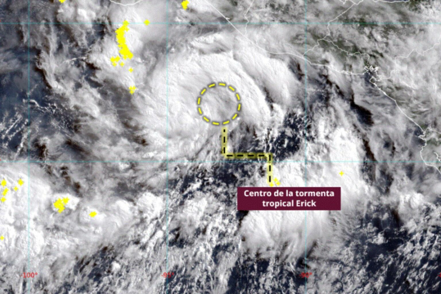 En su último aviso, el SMN indicó que el centro de la tormenta tropical “Erick” se localiza a 375 kilómetros al sur-suroeste de Boca de Pijijiapan, en Chiapas.