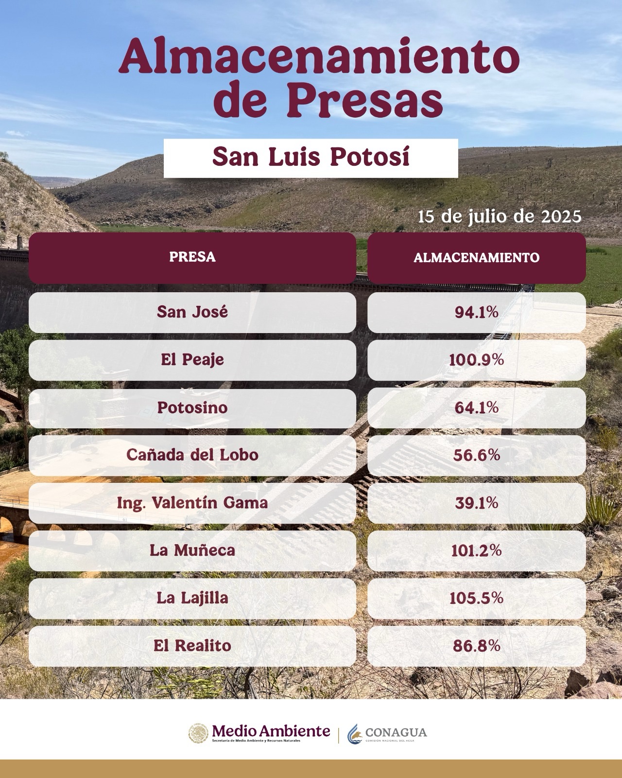 La Comisión Nacional del Agua (CONAGUA), a través de su Dirección Local en San Luis Potosí, informa a la población que, derivado de las lluvias registradas en las últimas semanas, las principales presas del estado presentan niveles elevados, sin que esto represente un riesgo para las comunidades aledañas.