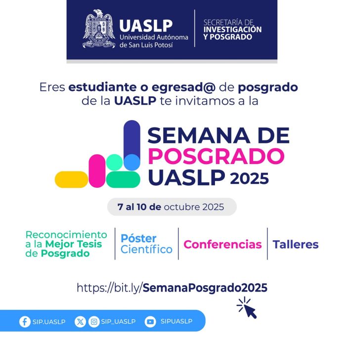 La Secretaría de Investigación y Posgrado de la Universidad Autónoma de San Luis Potosí (UASLP) realizará, del 7 al 10 de octubre, la Semana de Posgrado 2025, actividad que desde hace tres años busca fortalecer la integración de la comunidad académica de maestrías, doctorados y especialidades, informó el doctor Alexander Betancourt Mendieta.